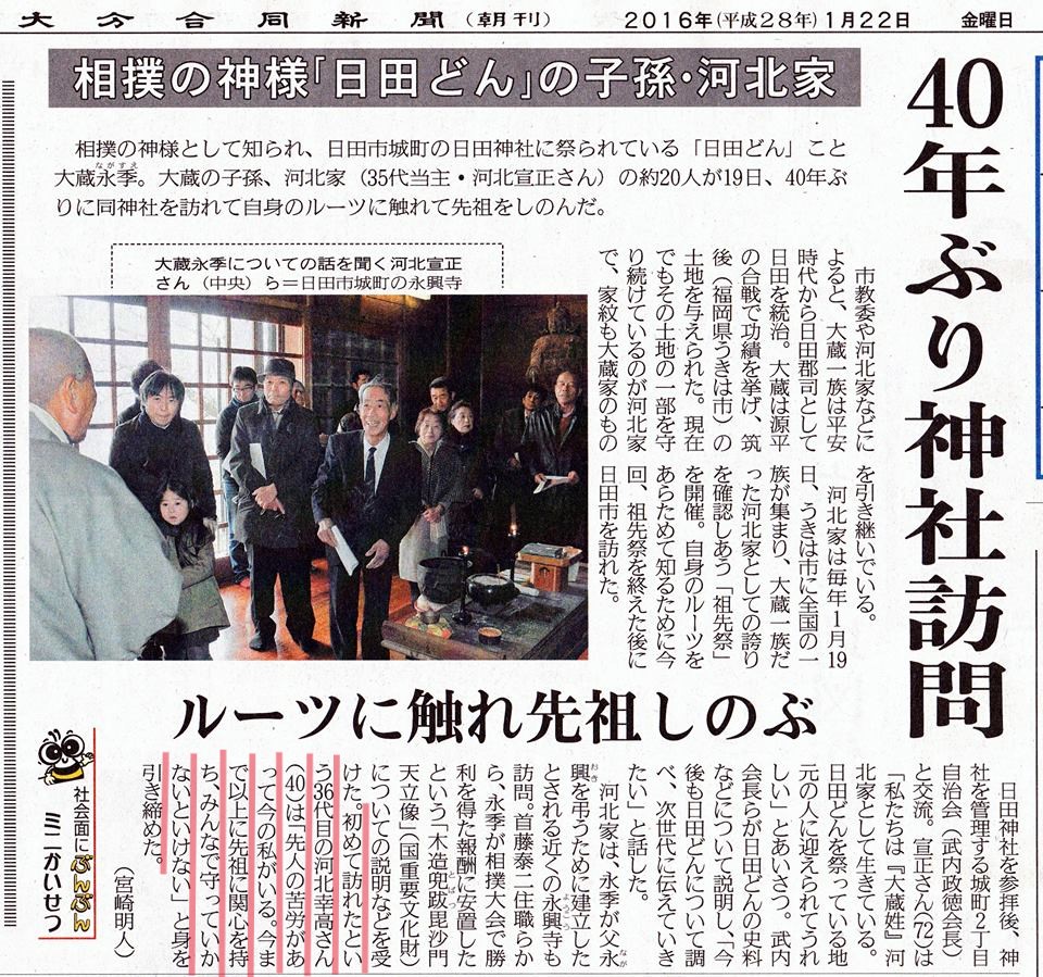 その「日田どん」の愛称で親しまれる相撲の神様「大蔵永季(ながすえ)」は、私から遡ること42代前の平安時代の河北家の祖先。最近よく話題に取り上げられます。