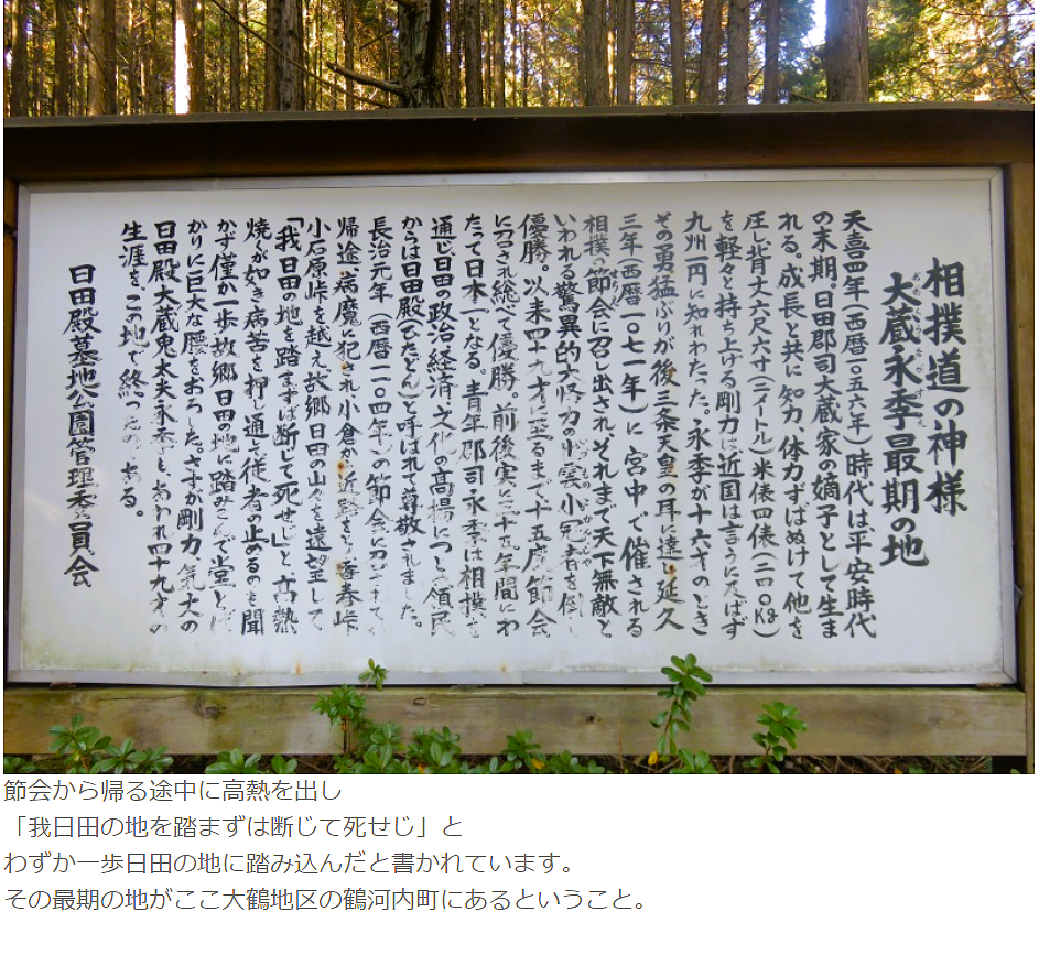 ・ 1104年(平安後期)、京都での相撲節会より帰国途中、 大肥庄村薄にて死去。▸▸ 大分県 日田市大鶴地区に「大蔵永季」の墓 がある。