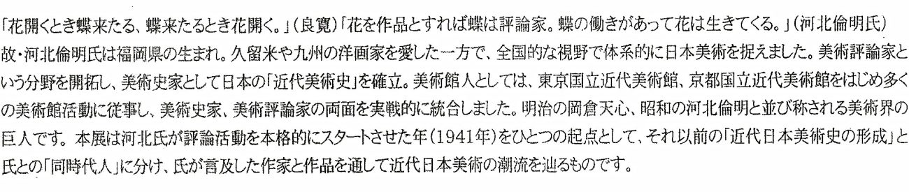 文部省美術研究所での研究傍ら、ユニークな視点と鑑賞眼で瞬く間にジャーナリズムの寵児となった河北氏は「 花開く時 蝶来る 蝶来る時 花開く 」という良寛の句を愛し、 作品を〝花〟に、批評家を〝蝶〟にたとえました。