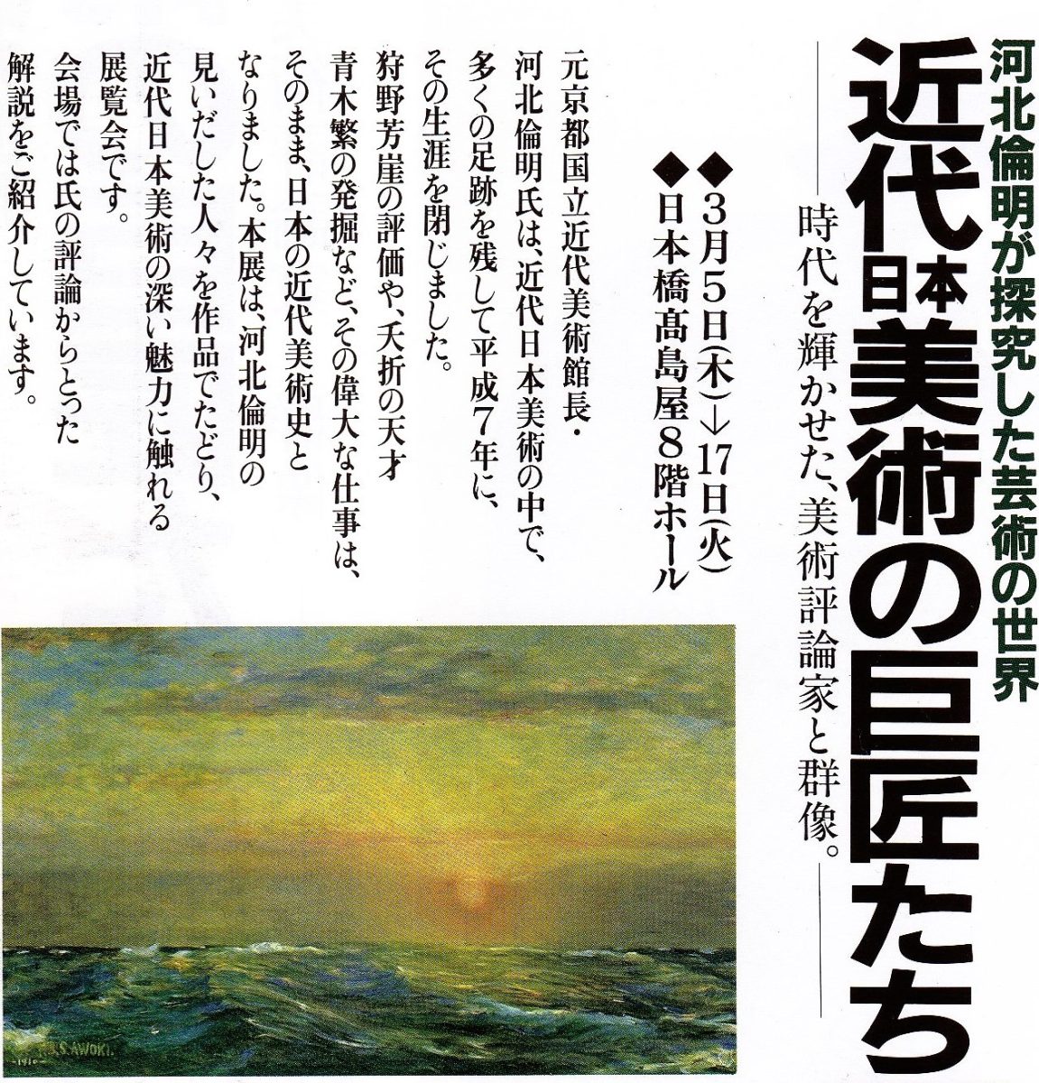 絵画展で河北氏がふりかえった絵は世に出るといわれ、 埋もれていた夭折の天才画家 「青木繁」や「坂本繁二郎」を世に知らしめたのも河北氏でした。