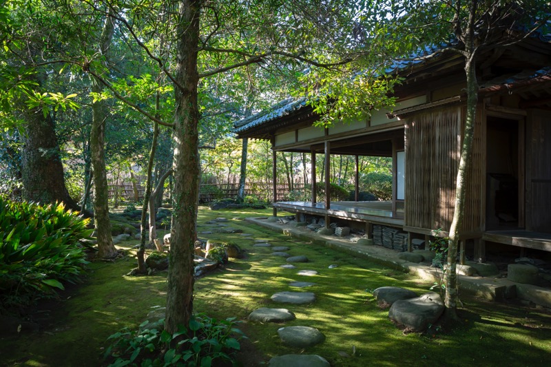 接客⽤に⽤意された⽊造平屋建ての「新座敷」へお邪魔すると、広々とした座敷の向こうに広がる庭園の美しさに圧倒される。聞こえるのは⿃のさえずりだけ。まるで別世界に⾜を踏み⼊れたようだ。河北さんがこの家を守りたいと思う気持ちがよく分かる。