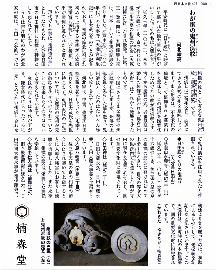 力士が相撲を取る姿を模した河北家の家紋 『相撲取り紋』。 相撲の神様「日田どん」こと大蔵永季は 42代前 (平安時代) の河北家の祖先。