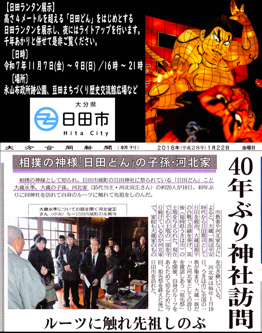 相撲の神様「日田どん」こと大蔵永季 (ながすえ) は 42代前の河北家の祖先。
