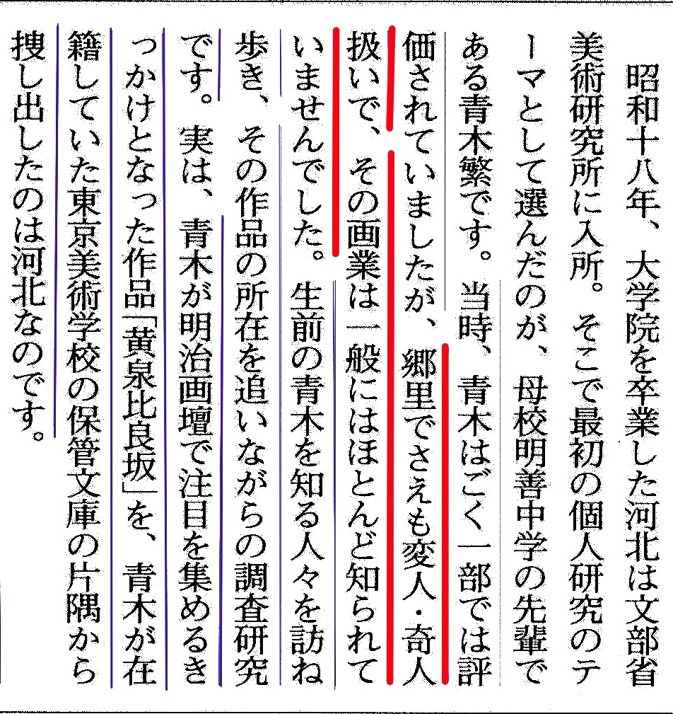 絵画展で河北氏がふりかえった絵は世に出るといわれ、 埋もれていた夭折の天才画家 「青木繁」や「坂本繁二郎」を世に知らしめたのも河北氏でした。