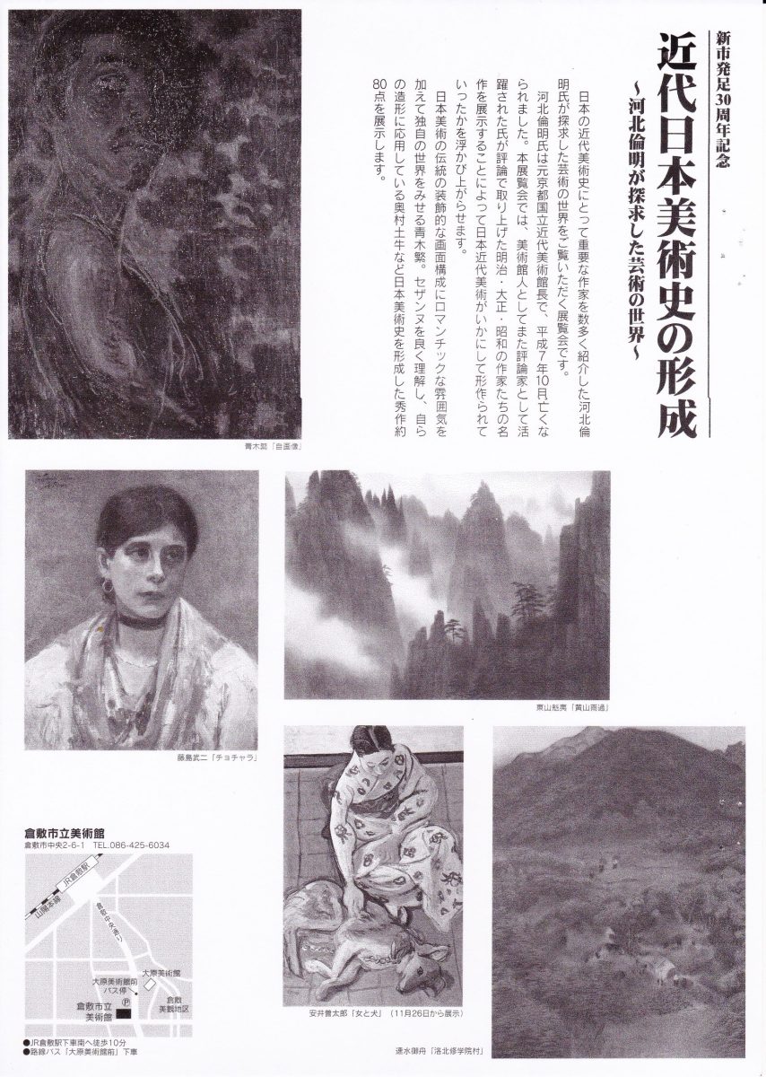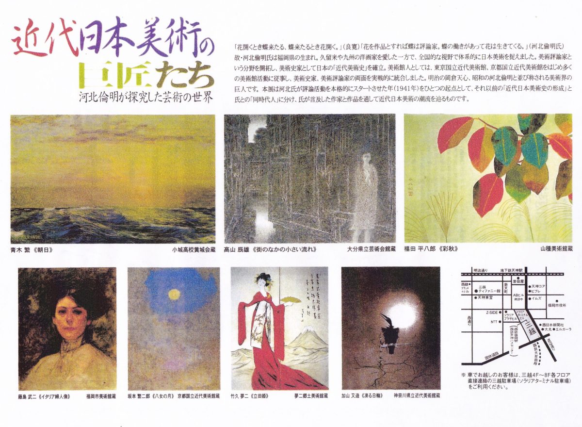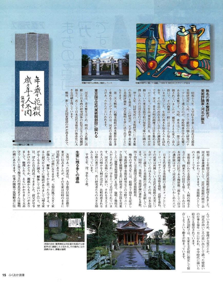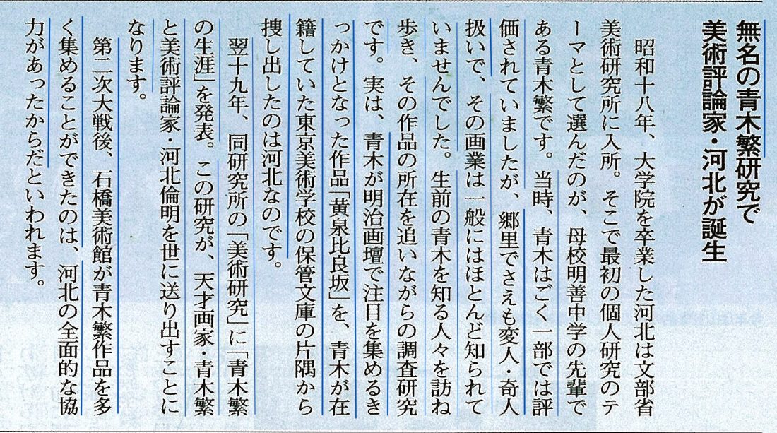 絵画展で河北氏がふりかえった絵は世に出るといわれ、 埋もれていた夭折の天才画家 「青木繁」や「坂本繁二郎」を世に知らしめたのも河北氏でした。