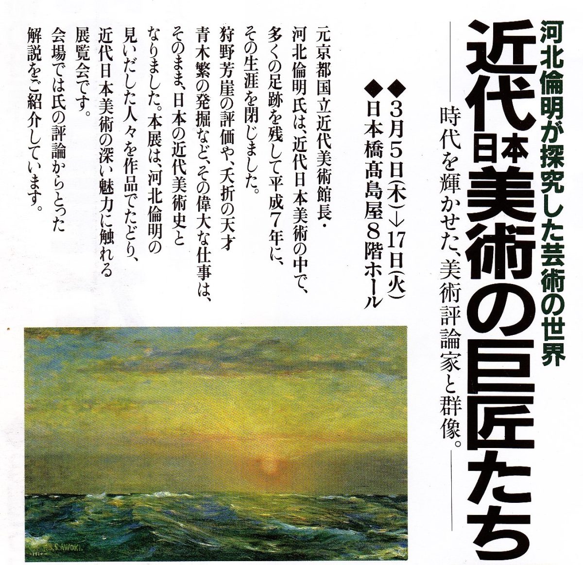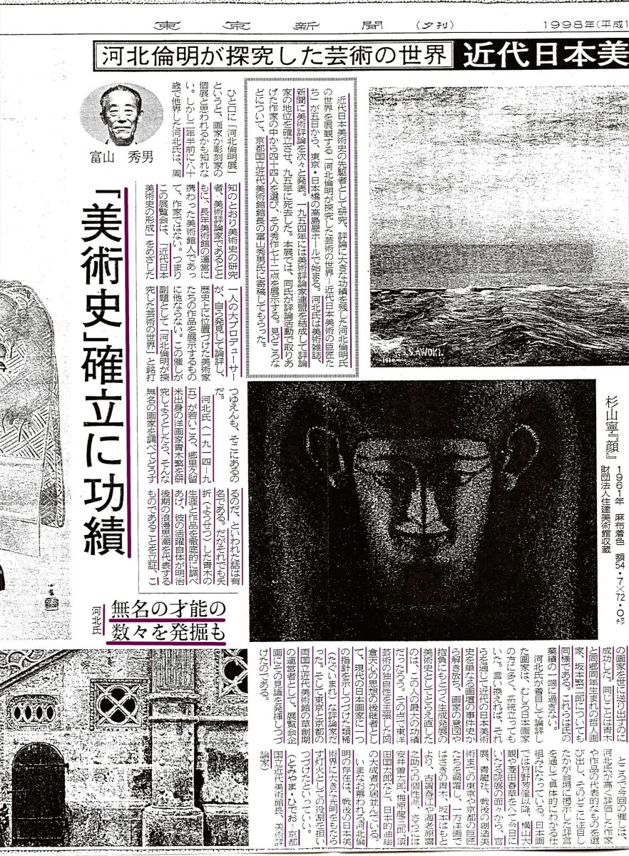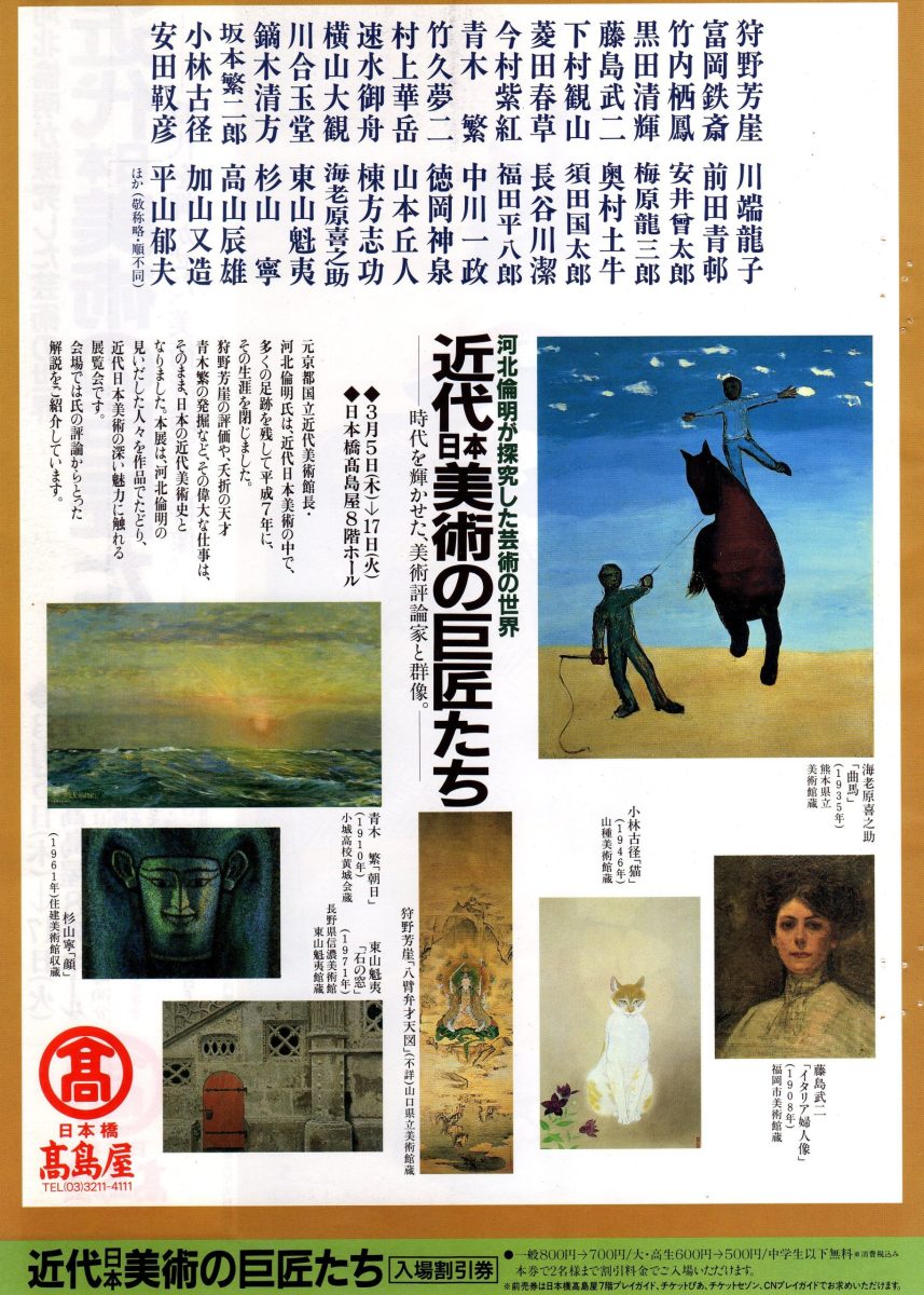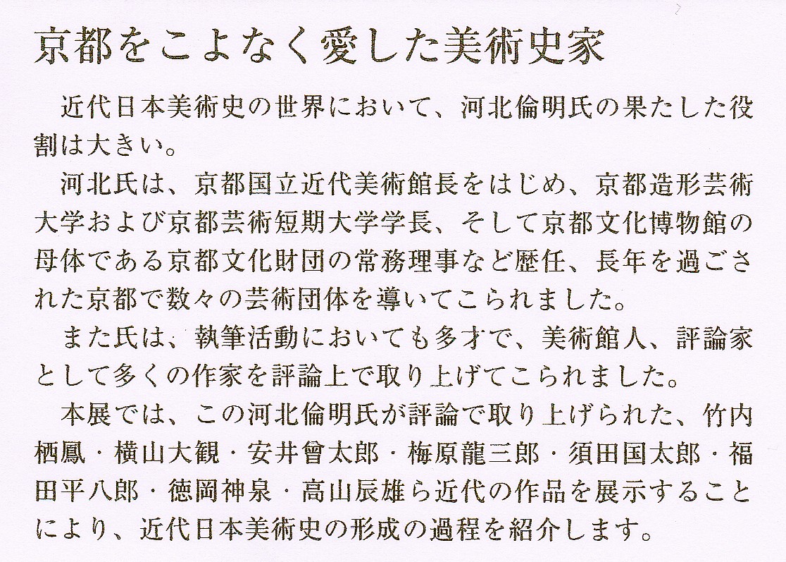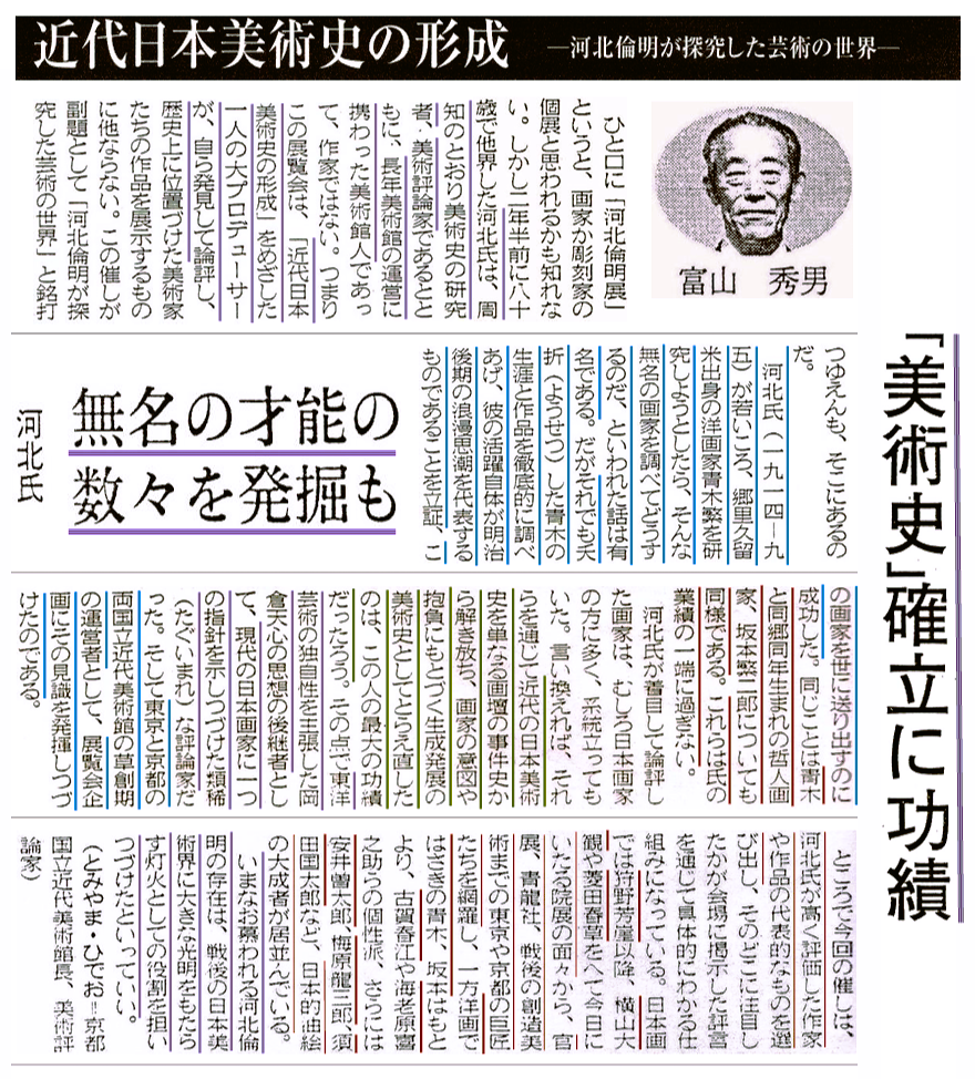 また、「狩野芳崖」の研究、「竹久夢二」の再評価、「平山郁夫」を見出し、異色の画家たちを発掘 紹介するなど 美術評論を次々と発表、 斬新な視点の展覧会は常に人々であふれたといいます。